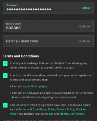 Using the bet365 Sportsbook bonus from Saturday Down South is a very simple process, as clicking any of the linked offers will automatically apply the promo at sign-up. Here’s a look at what the sign-up page looked like when I signed up: